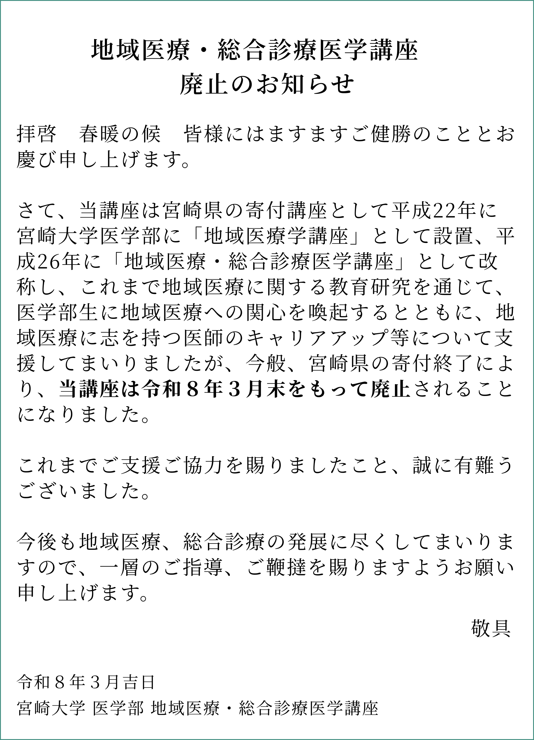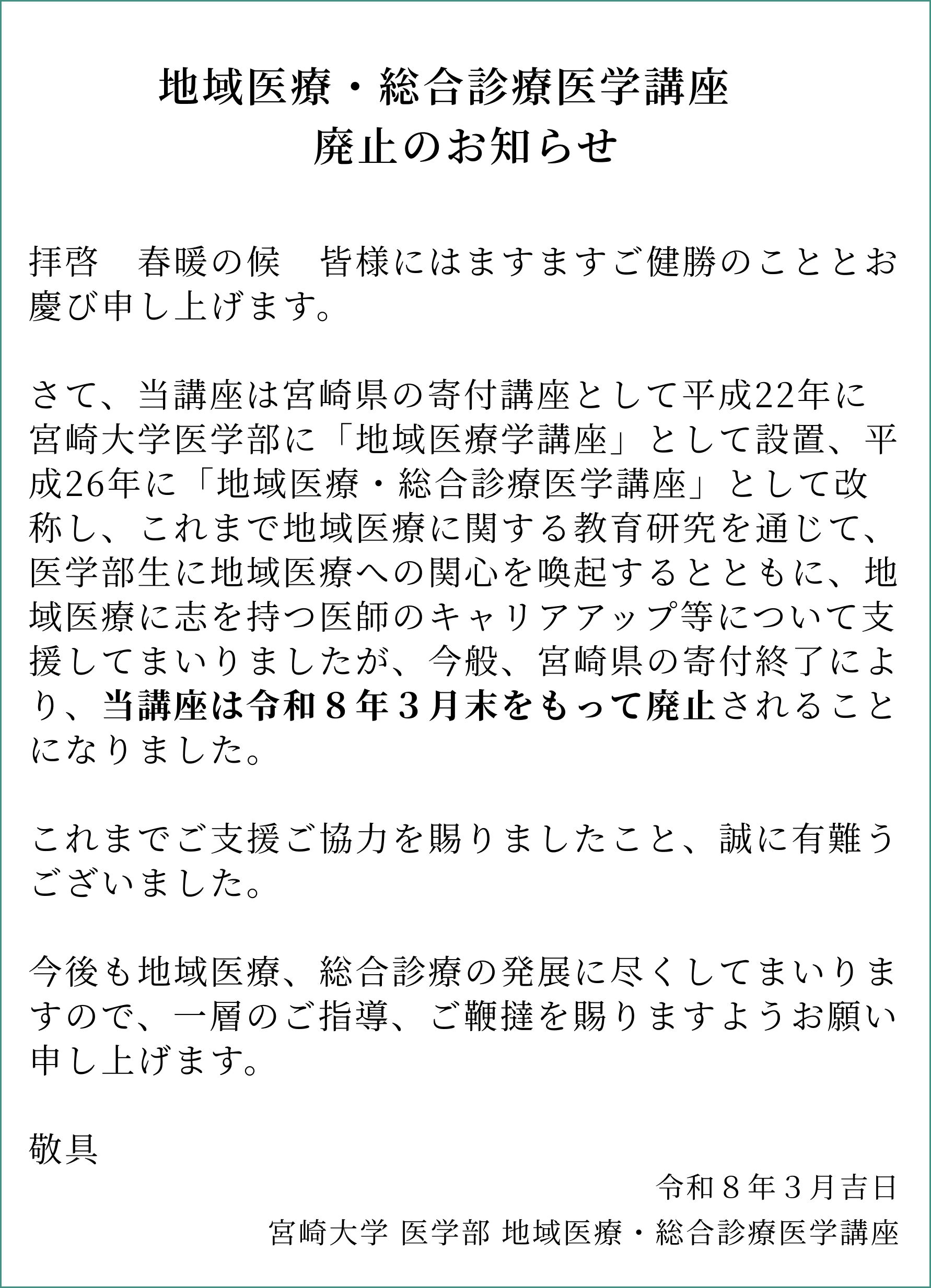 宮崎大学地域医療・総合診療医学講座は、平成22年より宮崎県との協定を結び、宮崎県からの財政支援(寄附金)を受け、運営されています。主目的は本県の各地域に対する医療支援ですが、地域医療に貢献する医療人の育成、地域医療に関する研究の推進も求められています。